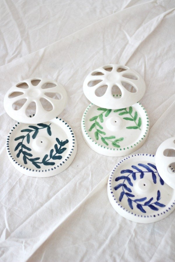 Con flores color petróleo pintadas a mano.